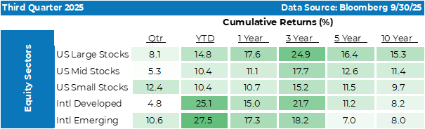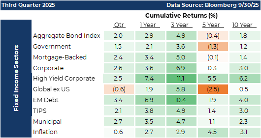 The third quarter of 2025 saw markets operating under an established global trading regime, featuring a base tariff rate of 10% and reciprocal tariffs on roughly 60 countries. This regime created a market respite, allowing stocks to trend higher during Q3. The estimated average effective tariff rate on imported goods is 23.1%, potentially raising $2.7 trillion in revenue over the next decade. Meanwhile, the bond market wrestled with a slightly softening job market, stubborn inflation metrics, and uncertain US debt and deficit picture. Finding clarity in this economic mix, the Fed lowered the target range of the Fed Funds Rate by 25 basis points in mid-September. The move was intended to approach a neutral policy stance, citing risks to both the inflation picture and concerns about a weakening employment environment.