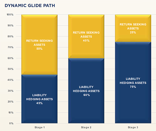By incorporating a dynamic glidepath approach, plan sponsors can control the impact of swings in investment returns, changes in liabilities due to interest rate movements and the impact of inflation on the plan over the long term.